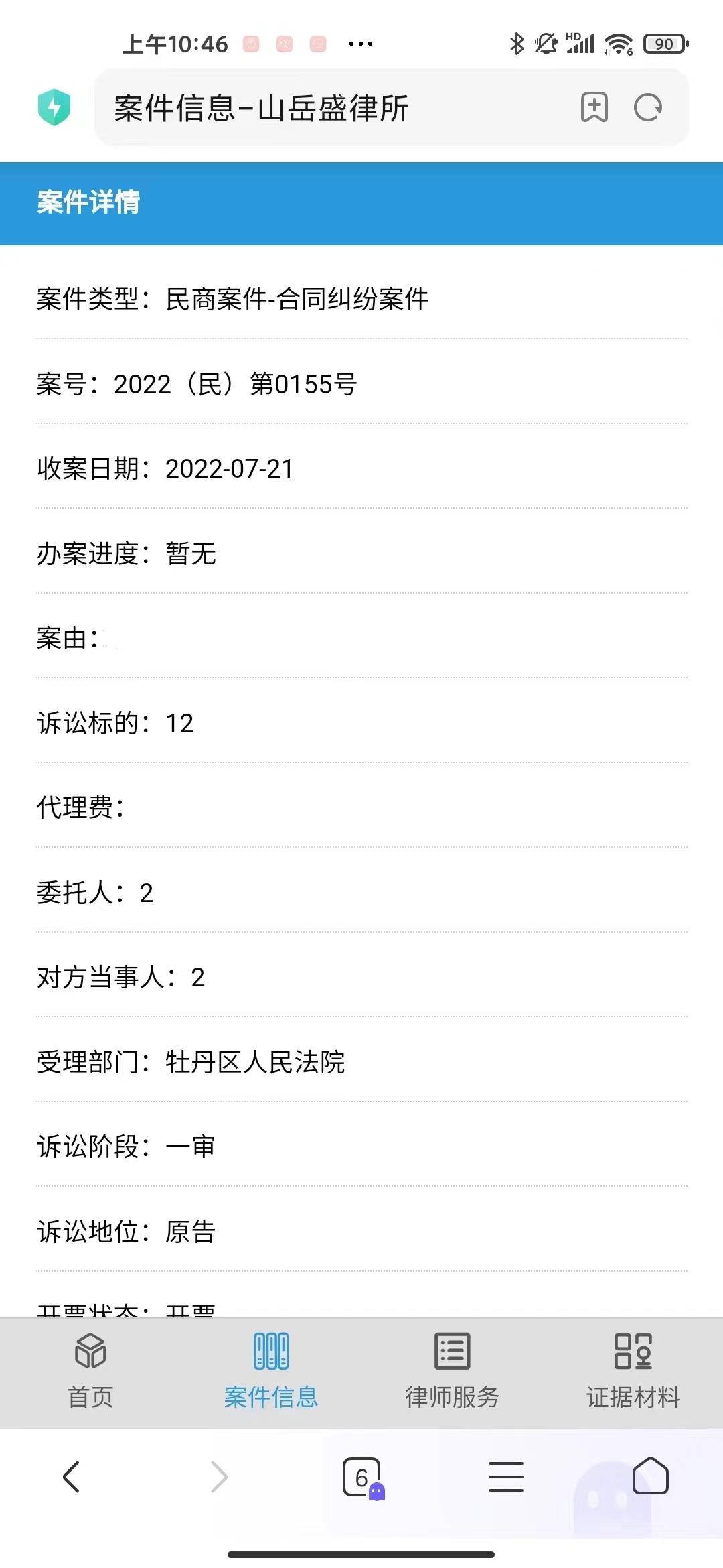 所有委托案件一经受理,即可收到我们的通知短信。客户可在短信中直接点击查询链接进入查询系统,通过点击【案件信息】可查询到客户委托的案件类型、收案时间、诉讼标的、律师费金额、诉讼阶段、发票开具情况、主办律师、协办律师、所属部门等信息;通过点击【律师服务】可以查询办案律师办理该案件的工作日志情况等;通过点击【证据材料】可以查询到办案律师所整理的法律文书和向法院提交的相关材料文件等。