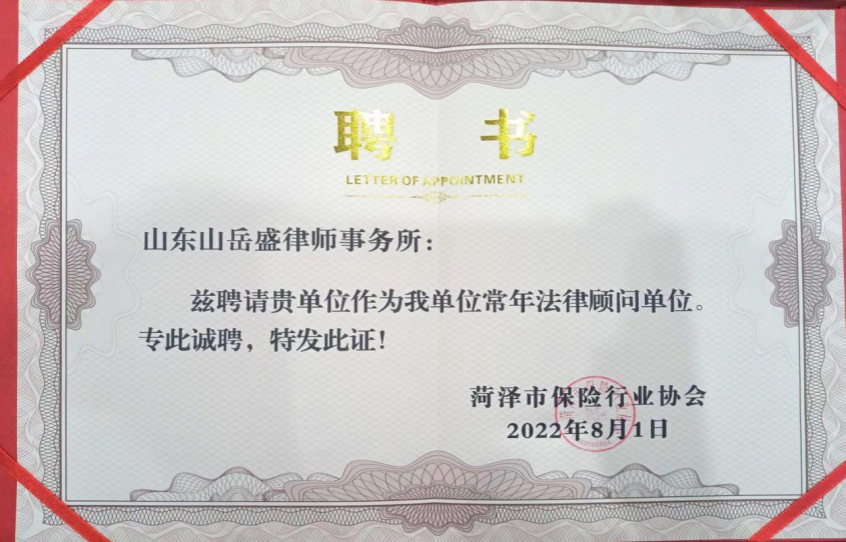 一纸聘书,一份担当|山东山岳盛律师事务所受聘为菏泽市保险行业协会常年法律顾问单位